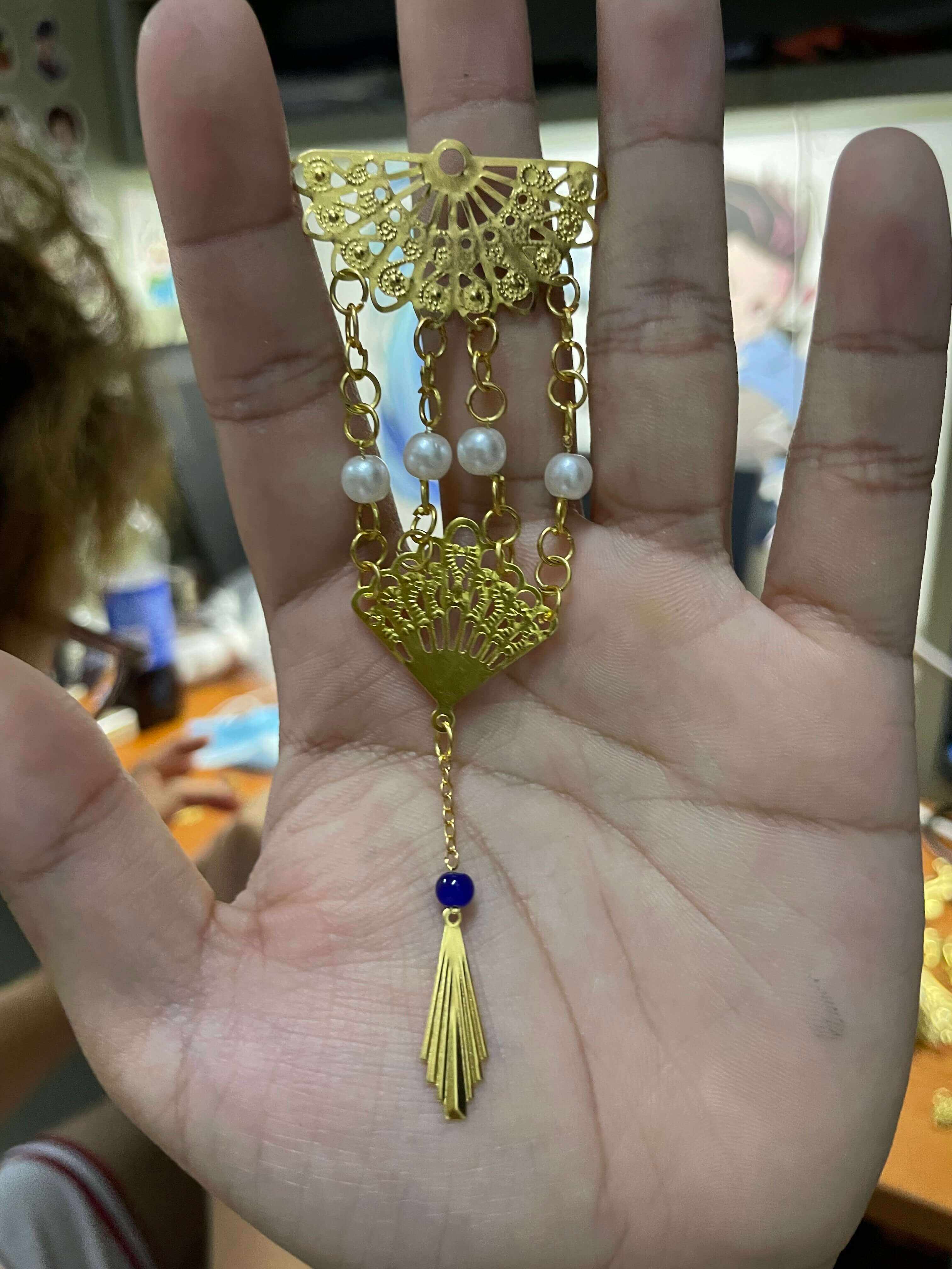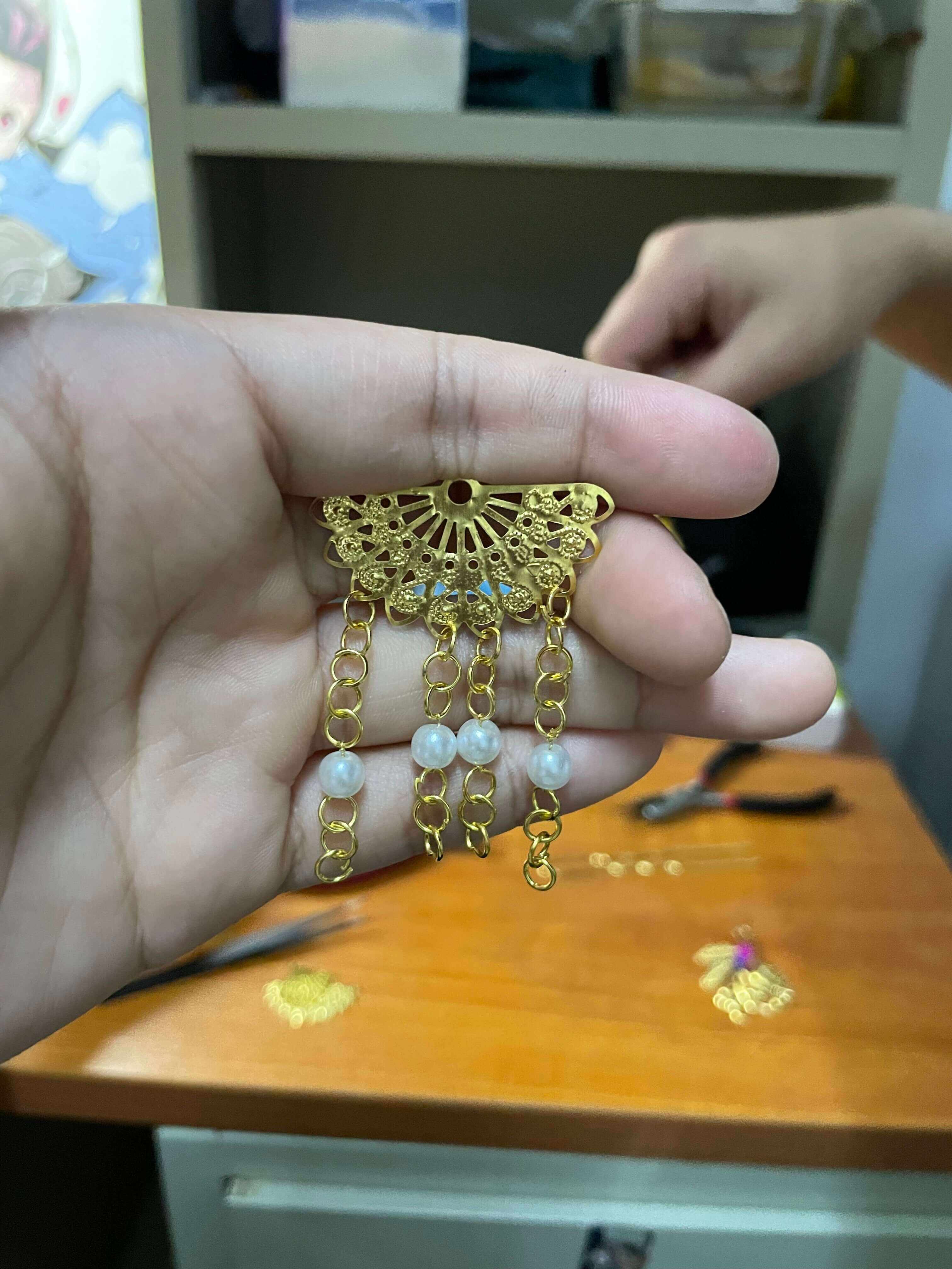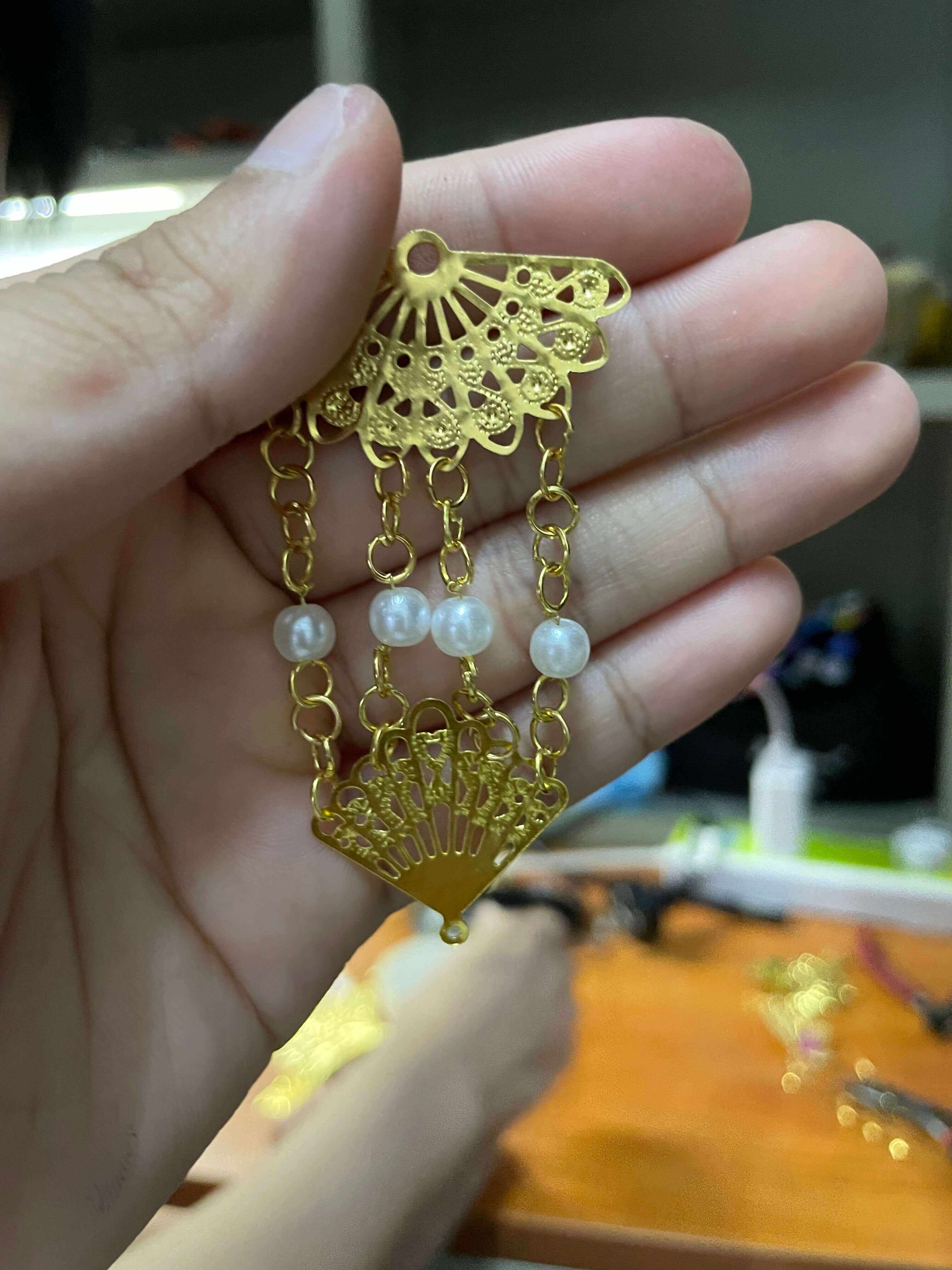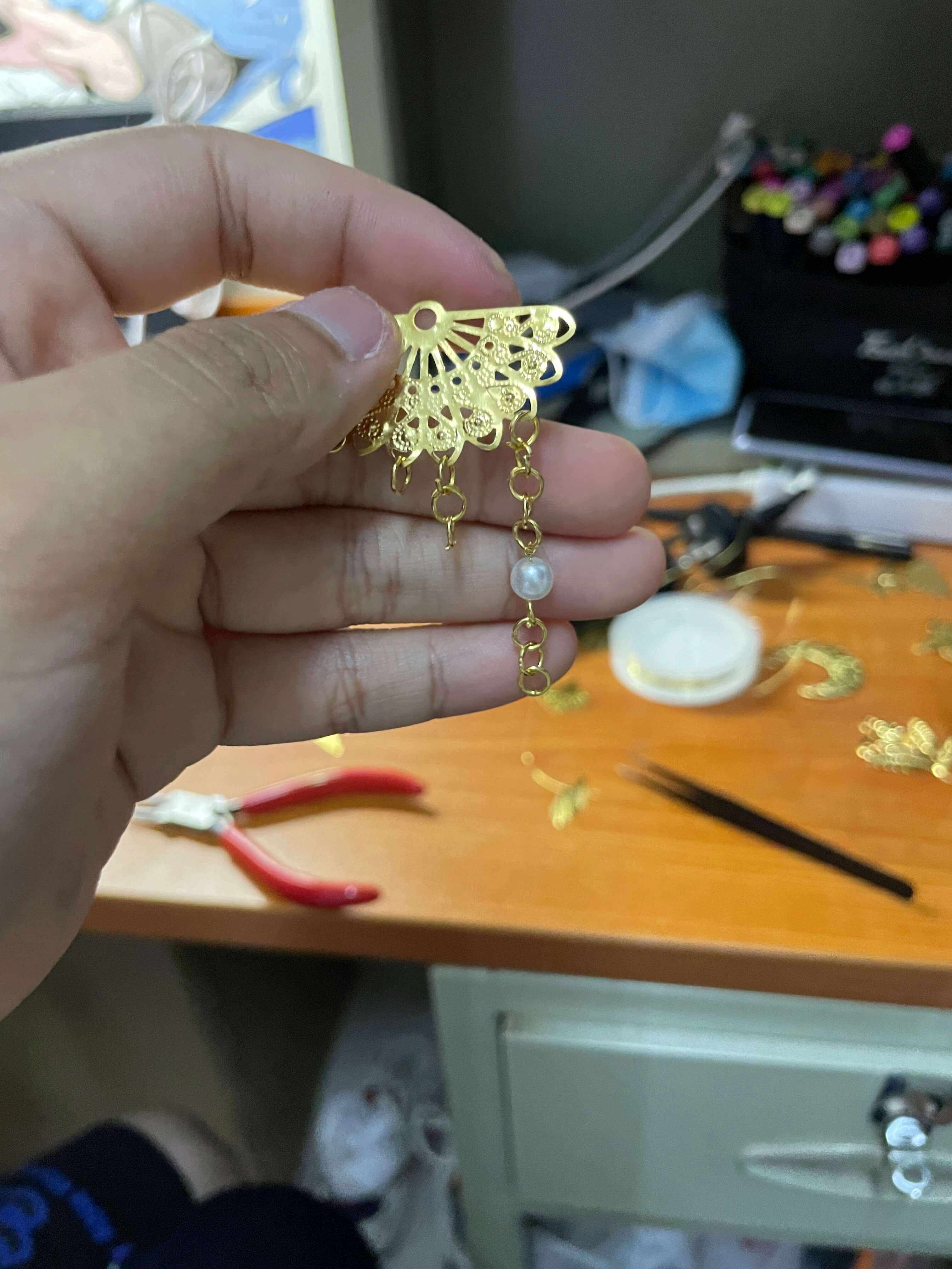 大致的步骤就是连接片+开口圈+铜镀金线+珍珠(线材连接)+铜镀金线+开口圈+连接片